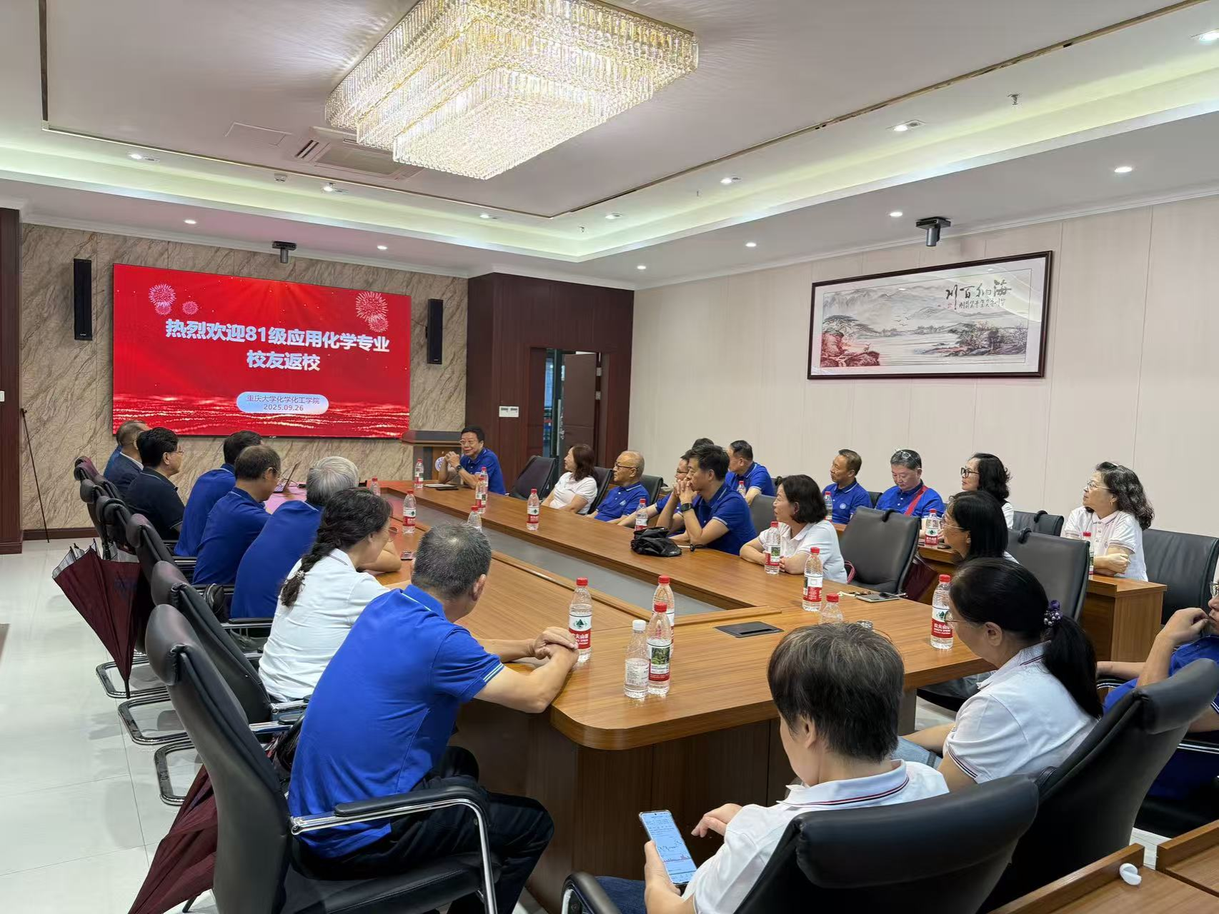 科学城校区理科楼LC202集合,受到学院领导、老师及学生志愿者的热情接待,“青春不散场”主题座谈会在学院会议室举行。学院党委书记张云怀、院长韩永生代表学院对校友们的归来表示热烈欢迎,并向大家介绍了近年来学校在学科建设、人才培养、科研成果等方面的发展情况。“母校始终牵挂着你们,也始终为你们感到骄傲。”张书记动情地说。81级校友作为改革开放后学校培养的早期应用化学人才,许多人在各自岗位上取得了卓越成就,为国家建设和社会发展作出了重要贡献。