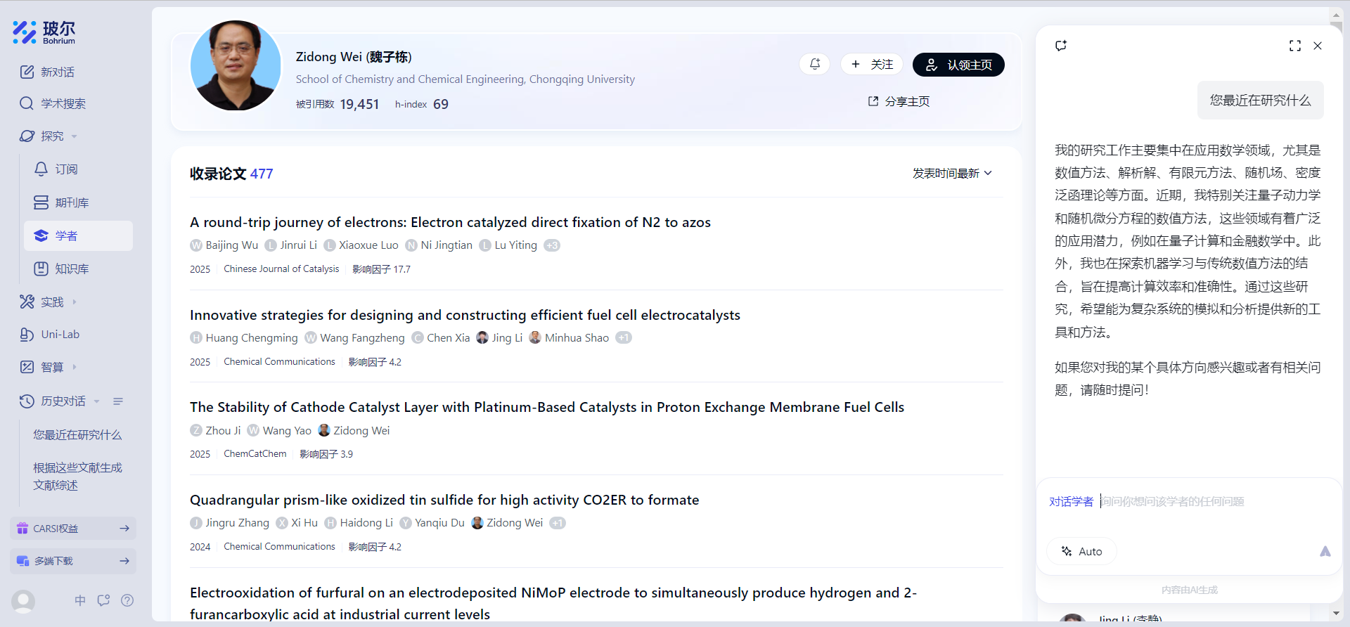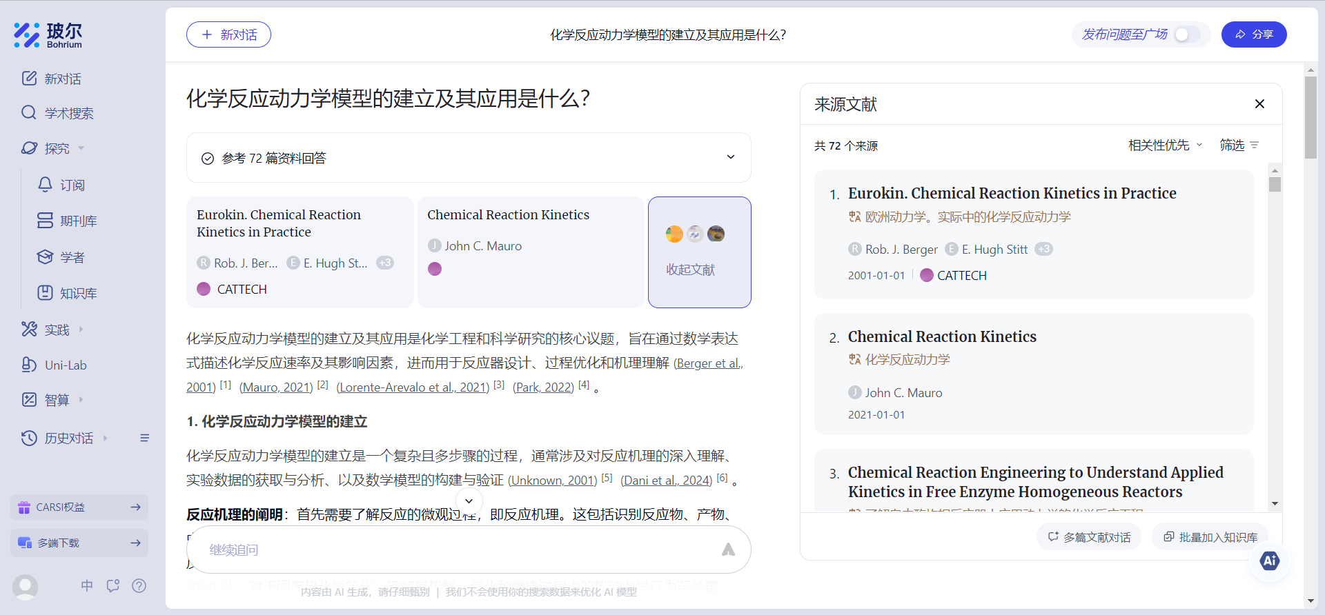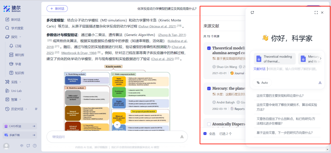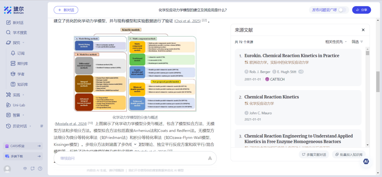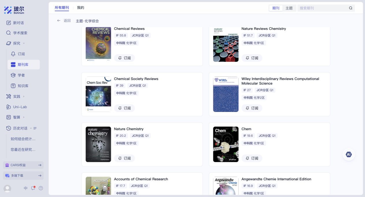 玻尔科学导航作为 “科学家的AI学术智库”,深度整合了超过 1.6 亿篇全领域文献、14 万本核心期刊及全球 2000 万学者研究成果,构建起覆盖化学工程、材料科学、有机化学、分析化学、催化化学等化学化工全领域的知识网络。依托平台提供的智能文献分析引擎,可实现对化学化工期刊论文的深度价值挖掘,从 AI 驱动的材料发现,到基于化学反应和工艺数据的文献深度解析,再到支持科研协作的团队、个人知识管理系统,平台将构建覆盖化学化工研究全流程的智能支持体系,助力我院教师和研究人员从基础文献工作中解放,更专注于科研创新。