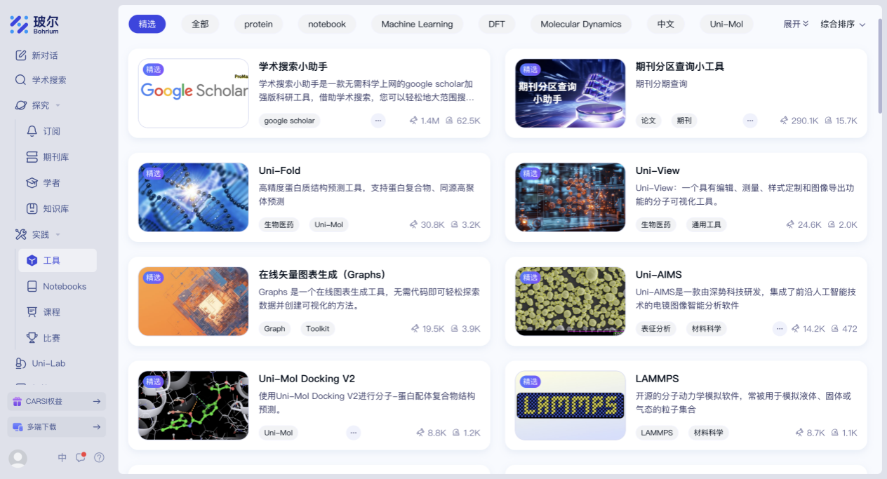 科研之外,玻尔还提供超 200 项科研工具APP,涵盖图表绘制、文献管理、数据分析、可视化建模等多个环节,均可灵活调用;并提供百余门 AI for Science 课程资源,你可以自由开展 AI for Science 相关内容的学习和拓展。