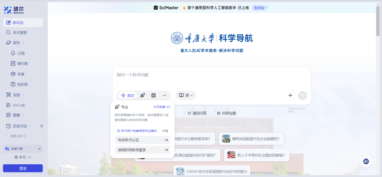 推出“新一代科研知识库与 AI 学术搜索平台”——玻尔科学导航。该平台基于前沿人工智能技术,深度融合智能检索与知识问答功能,旨在解决学术信息分散、文献获取效率低、研究协作不便等科研痛点。平台以推动学术创新为目标,为我院研究人员提供精准、深度、可靠的智能文献检索与知识发现服务,构建智能化、高效化、可信化的科研支持体系,全面赋能化学化工研究工作。