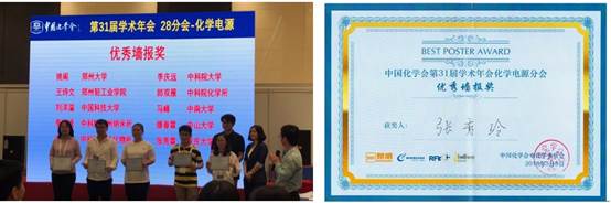 中国化学会学术年会每两年举办一届,是国内化学界的学术盛会,为我国化学领域广大化学工作者的学术交流和合作提供优质的平台。本届年会主题为“构建化学新时代”,倡导全国化学工作者站在新的历史起点上,集中智慧,重新定位化学的未来发展。本次参会代表达到1万3千余人,规模创历届年会之新高。年会期间,共设立学术分会48个,专题论坛11个,交流论文805余篇,安排分会邀请报告1418个、分会口头报告1486个,墙报展示3554个。其中,共评出优秀墙报奖200项,由参会代表现场投票产生。张秀玲博士在本次年会上参加了化学电源分会,会议闭幕式上,由分会主席程方益联合新威公司代表共同颁发了获奖证书。