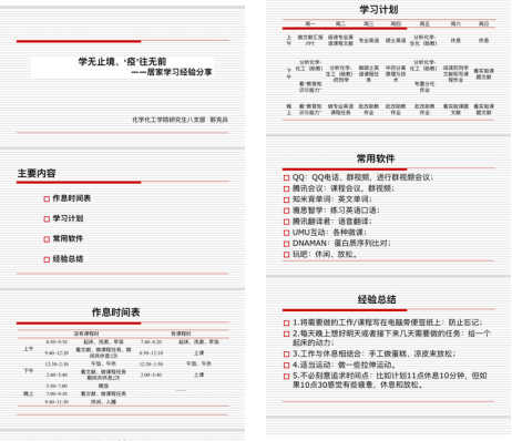 “停课不停学”,关键时期更不能放松学业。研究生八支部通过网络视频组织生活和学习经验分享的形式开展了“学无止境、‘疫’往无前”特色组织生活,支部党员以线上视屏讲解的方式展示了疫情期间自己的学习方法,分享自己或者身边同学在家的学习经验、学习计划、常用软件、作息时间表等,相互交流学习,共同进步。