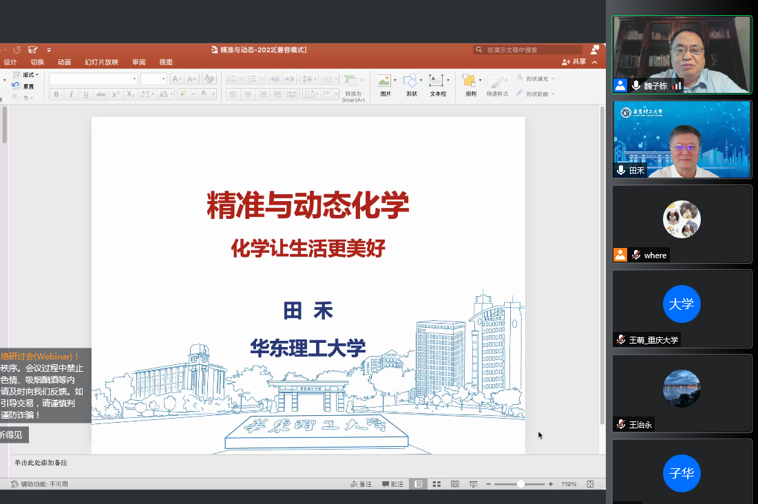 协办的“精准与动态化学——化学让生活更美好”专题讲座在线上举行。本次讲座邀请到中国科学院院士、发展中国家科学院院士、华东理工大学田禾教授做报告。讲座由足球博彩