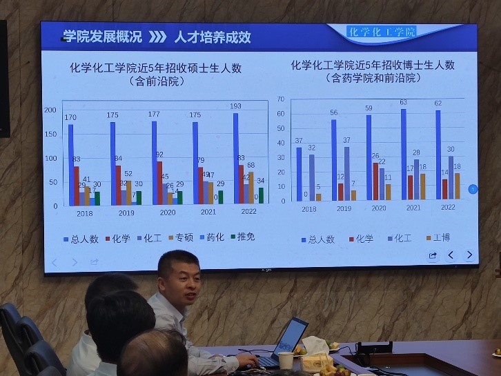 接下来,胡宝山副院长向老同志们汇报了学院一年来主要工作进展情况:目前我院学科持续发展,化学学科已经进全球前0.11%,化工学科地位迈进全球前35位;近几年经费保持持续增长;国家基金获批数稳定在全校第一梯队中;发表的论文呈高质量增长。