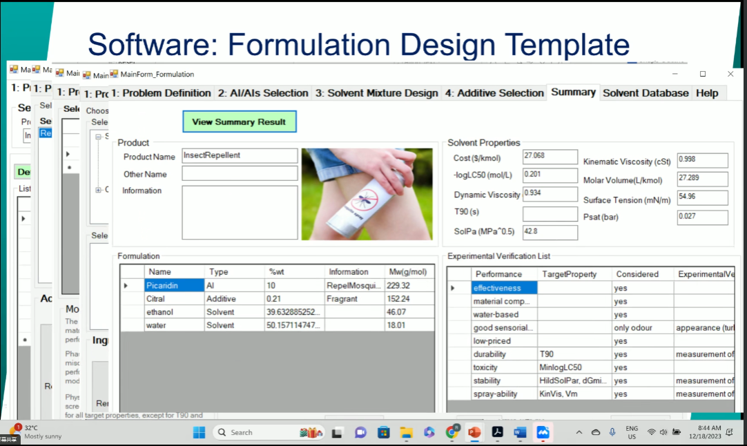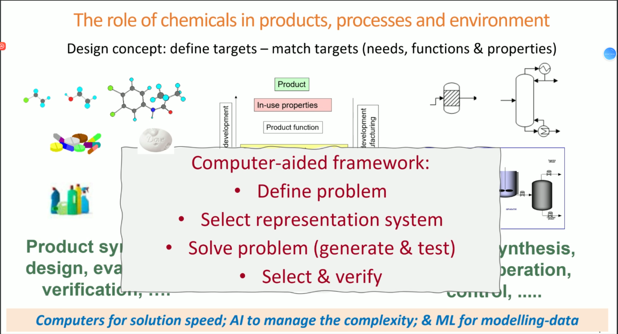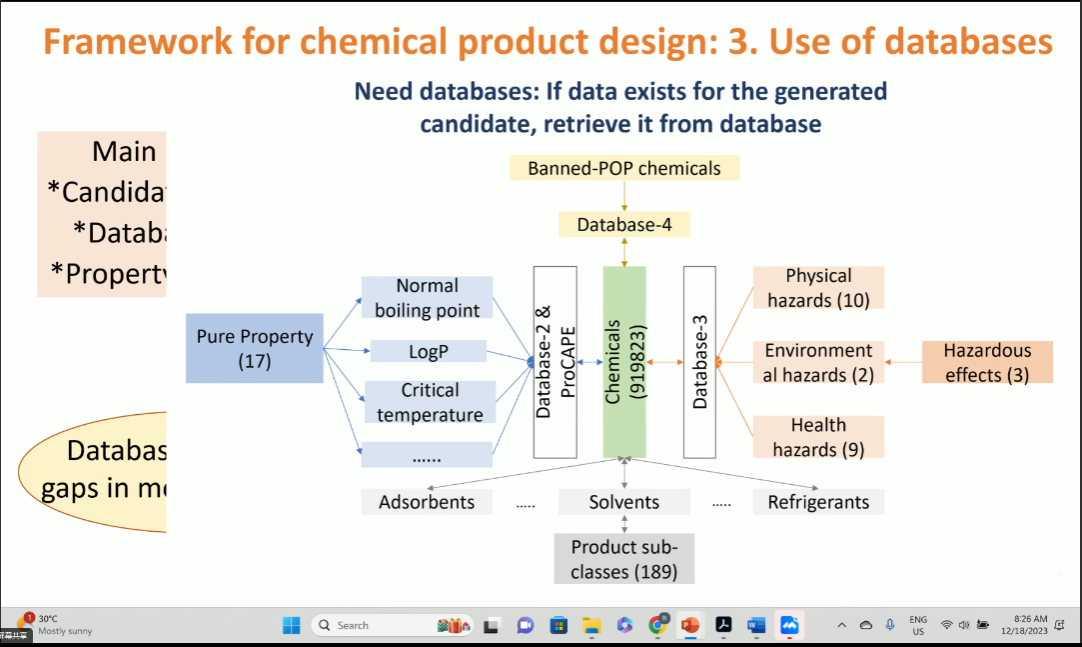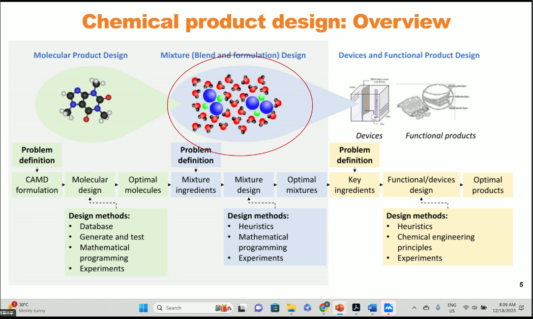 Rafiqul Gani教授的报告中总结了化工产品设计的设计理念,不论是分子产品设计、混合物设计或是设备和功能产品设计,在所有情况下,都制定了一组所需的属性,并确定了与它们匹配的候选属性。所以计算机辅助框架需要定义问题、选择表示系统、生成并测试解决问题的方案并进行选择和验证。