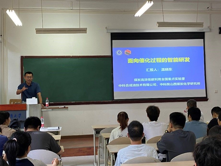 虎溪校区1教1112室,中国科学院山西煤炭化学研究所煤炭高效低碳利用全国重点实验室主任、国家级高层次人才温晓东研究员访问学院,并以《面向催化过程的智能研发》为题进行学术报告。报告会由学院胡宝山副院长主持,约50名师生出席并聆听了报告。
