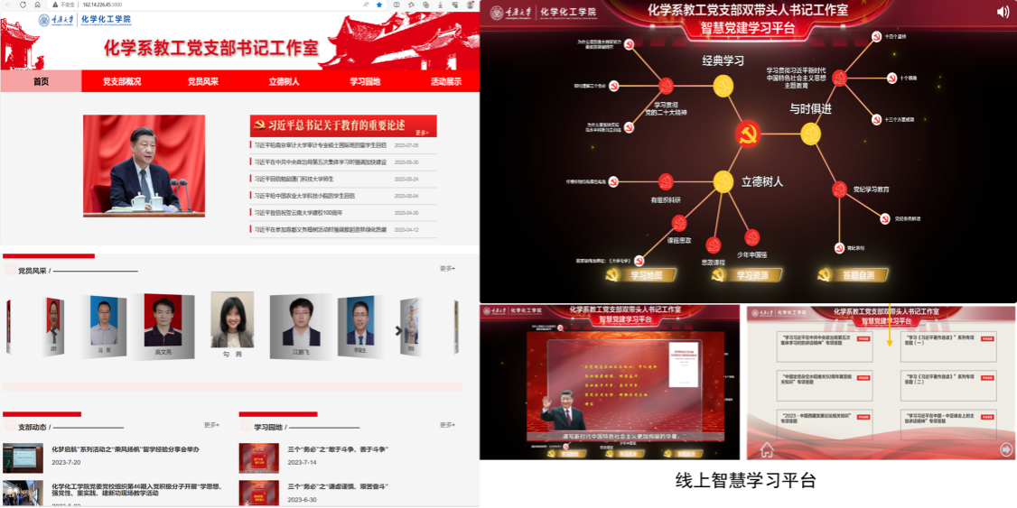 “党建+学术科研”:党支部围绕 “有组织科研”,积极开展跨校跨专业专题组织生活,牵线搭桥学科交叉;制作教师成果互动体验视频,上传工作室线上平台推广转化。近年来,党支部所辐射的化学系教师发表CNS正刊及子刊论文10余篇/年,多项成果获企业应用。