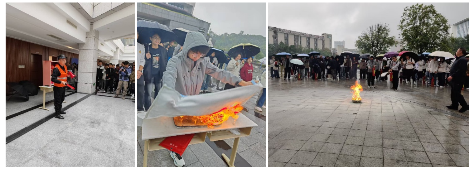 实验室安全事故演练——消防灭火实训演练在理科楼广场进行。首先,保卫处工作人员向同学们详细讲解并示范了灭火器、灭火毯等消防器材的正确操作方法和注意事项。随后,同学们在保卫处工作人员的指导下分组实操,依次使用干粉灭火器、灭火毯扑灭石油醚燃烧火焰。通过亲身体验,同学们不仅掌握了常见消防器具的正确使用方法,也切实锻炼消防灭火能来,提升应对初起火灾的实战能力。
