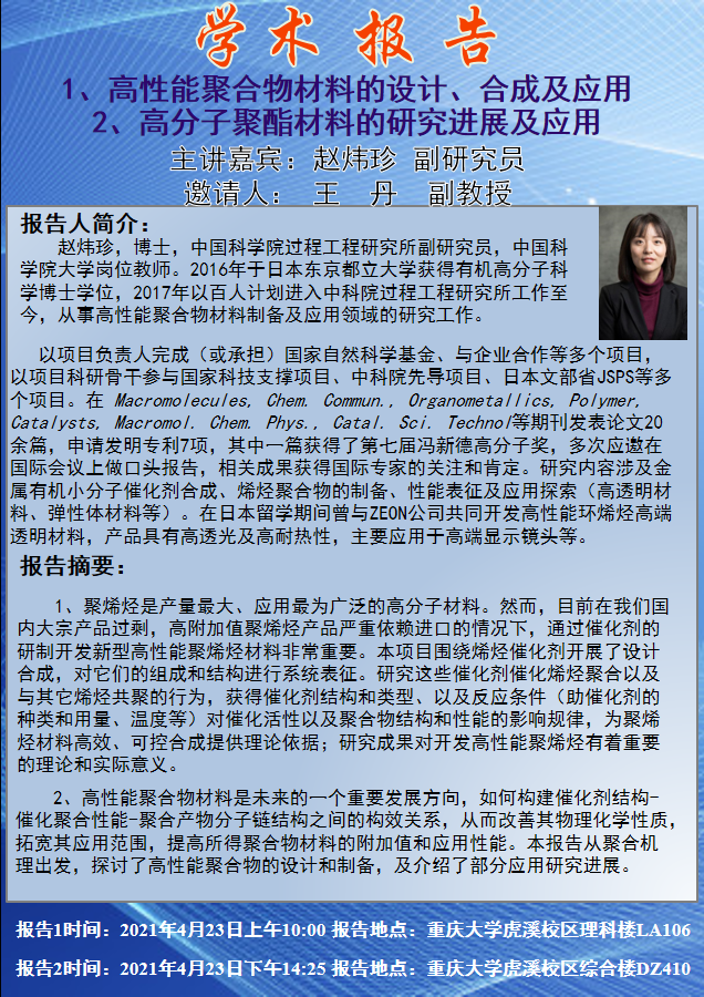 高性能聚合物材料的设计、合成及应用 赵炜珍 副研究员