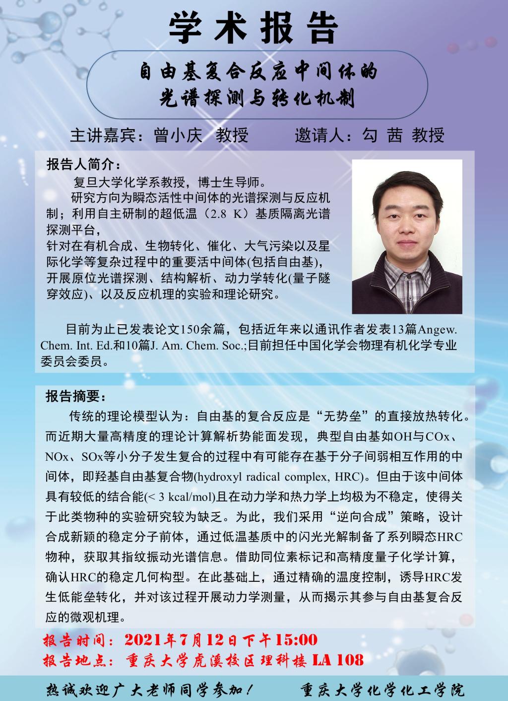 自由基复合反应中间体的光谱探测与转化机制 曾小庆教授