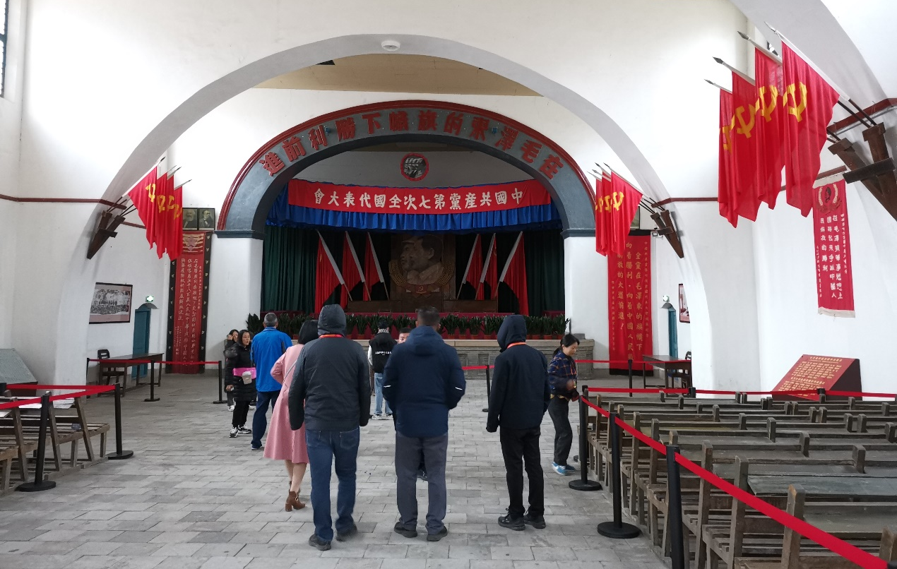 尽管寒风习习,但学员们学习激情依旧不减。一行人继续走进中央大礼堂学习参观。这里是中共七大召开的地方,七大会期50天,是党的历史上时间最长的一次全国代表大会,七大是“团结的大会、胜利的大会”,是载入史册的大会。从此中国共产党实现了政治上、思想上、组织上的真正成熟,达到了空前的团结统一。毛泽东思想开始写在党的旗帜上,成为全党的指导思想。习近平总书记曾在2015年、2022年先后两次来到杨家岭革命旧址,瞻仰中共七大会址。今天学员们跟随总书记的步伐来到这里学习,从革命旧址中领悟延安精神,从历史的细节中汲取精神力量。
