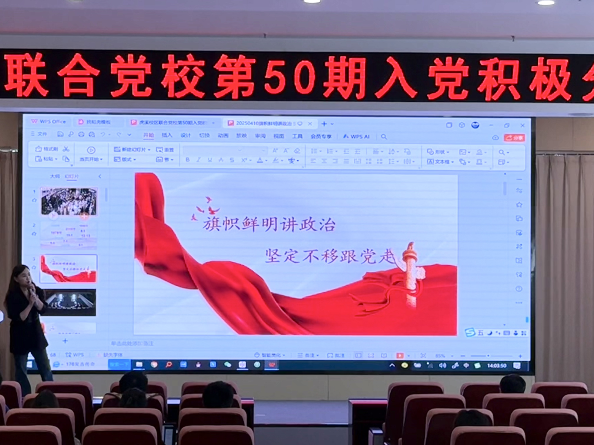 马克思主义学院的刘倩副教授。本次专题学习以“旗帜鲜明讲政治,坚定不移跟党走”为主题,通过理论讲解、互动问答和党史回顾等形式展开,深入学习了党的历史、理论和最新精神。