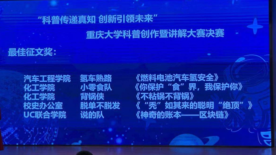 两支队伍从初赛一路过关斩将,最终进入到12月19的决赛。决赛共有20个队伍参加,决赛队伍既有来自机械工程学院、美视电影学院、UC联合学院等多个学院的代表队,也有来自校史馆和科学协会的讲解队,可谓强手如云。在比赛中,来自我院大三年级的牟玥同学代表小零食队于第八位上场,她沉着冷静,条理清晰,为大家揭开了食品添加剂的神秘面纱,打消了大家对食品添加剂种种误解。来自我院大一年级的许耘浩同学代表背锅侠队于第十位上场,作为全场少有的大一同学,他克服重重压力,迎难而上,从容不迫地为大家科普了不粘锅可以不粘住食材的原理,解开了大家对不粘锅的种种疑惑,赢得了台下观众的阵阵掌声。