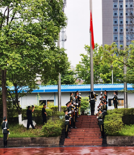 随着“升国旗,奏国歌”的口令,嘹亮的国歌声响起,鲜艳的红色缓缓上升至杆顶,五星红旗在微风中飘扬。虽然是雨天,同学们却主动收起雨伞,全体肃立行注目礼,并高唱国歌,由衷地表达自己对祖国的热爱和敬意。
