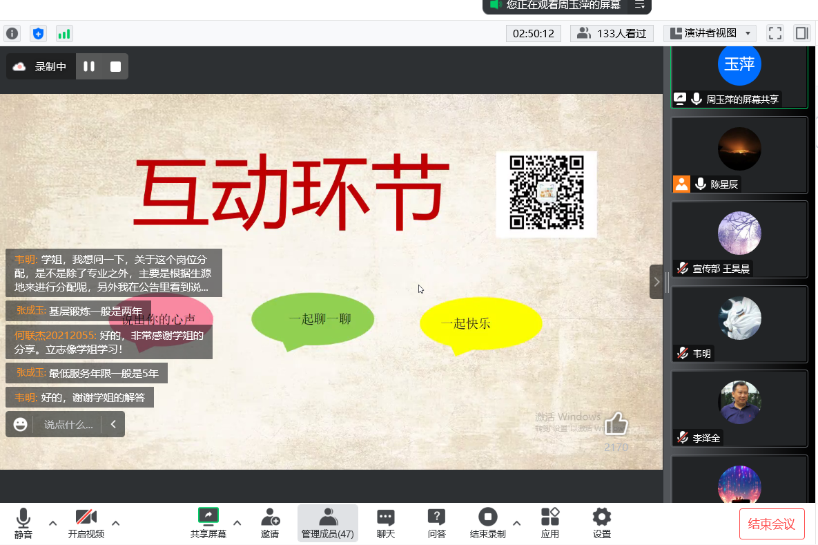 最后,周学姐向我们分享了她的工作感悟。她提倡在工作中学会“三比三忘”:忘掉过去,忘掉学历,忘掉荣光,比贡献,比进步,比成绩。特别强调阅读能力的重要性,希望同学们志存高远,脚踏实地。同时学姐还给出了关于备考及面试的建议并认真解答了同学们提出的问题。