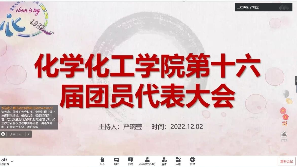 团代会在线上顺利召开。化院党委副书记李泽全以及陈星辰老师出席此次会议,学院各团支部书记、团员代表160人参加。会议由组织部副部长严琬莹主持。
