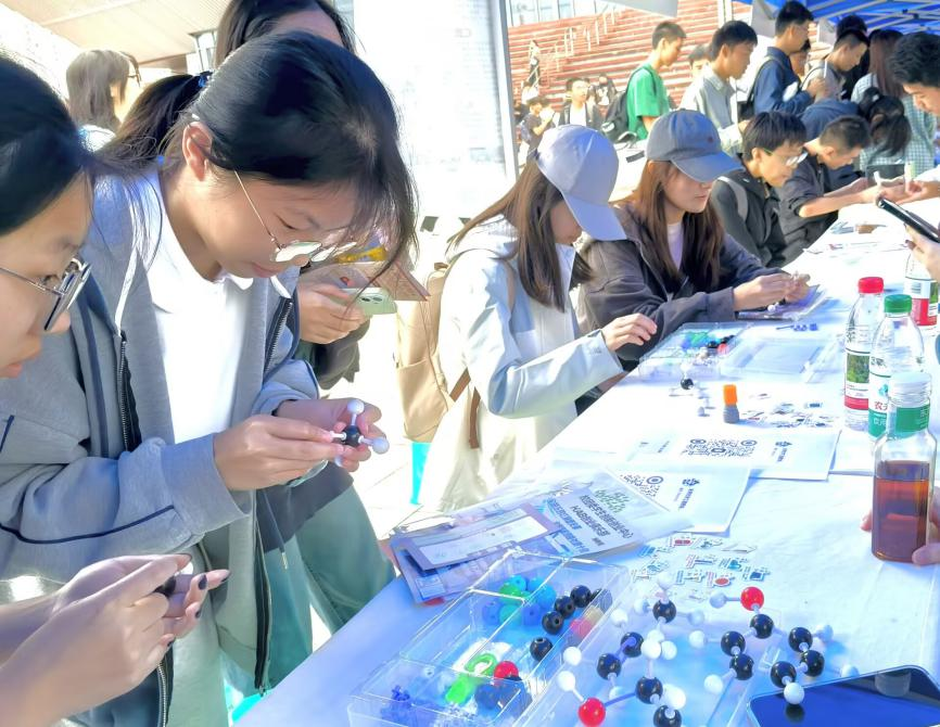当日上午9时,“百团纳新”活动正式开启,社团展台周围随即站满了前来参与活动的同学。为打破传统纳新的单调模式,社团成员提前筹备了两大特色互动环节:其一为化学知识问答,既能唤醒同学们的课堂所学,开启一场“化学头脑风暴”,又能激发探索兴趣,不少同学在答题时互相讨论、共同思考;其二为分子球棍模型搭建体验,社团准备了多套模型组件,让同学们亲手将课本上抽象的化学式,转化为可触摸、可观察的立体分子结构,原本晦涩的化学概念在动手实践中变得直观易懂,吸引了同学们的好奇尝试。与此同时,协会带来的钥匙扣、贴纸等纪念品,也让参与互动的同学们收获满满,进一步拉近了社团与学子的距离。