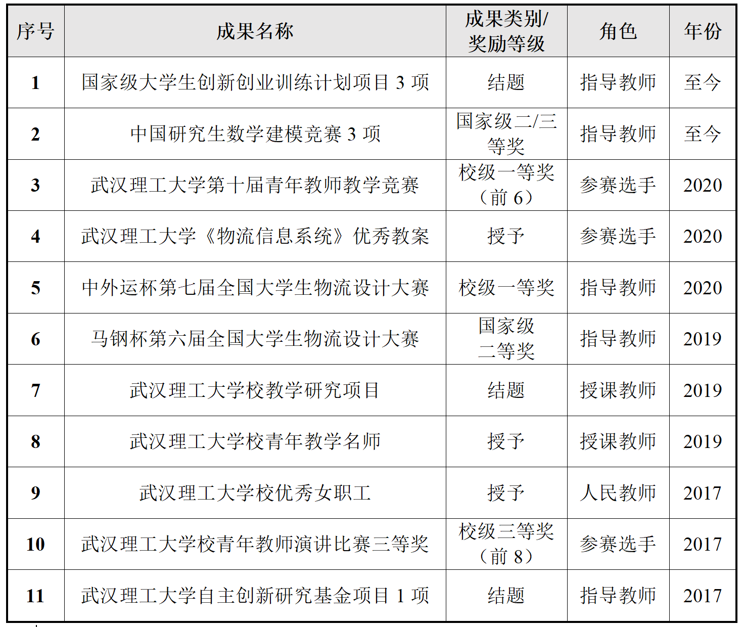 指导本科生、研究生开展科技创新创业,获得国家级奖励7项,校级奖励2项;参加校级教师教学类比赛等,获得校级教学成果6项。